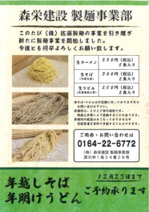 2025年4月より(株)佐藤製麺の事業を引き継ぎ㈱森栄建設 製麺事業部として新たに製麺事業を開始いたしました。